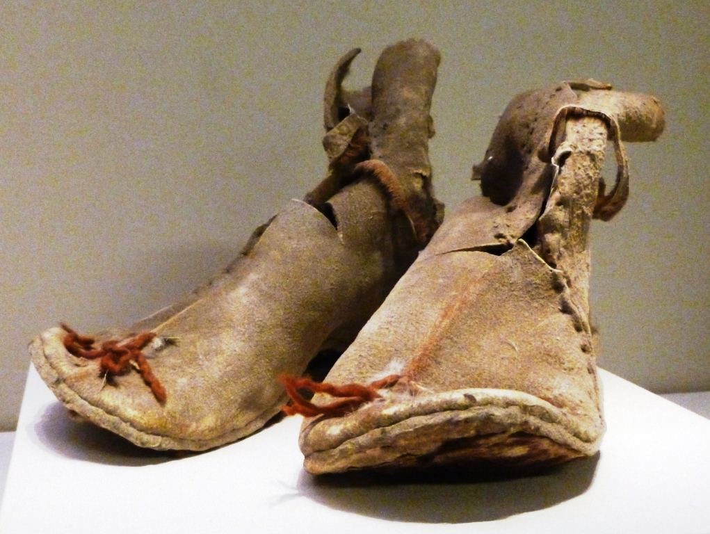 These boots are Ox hide boots from Loulan, Xinjiang, China. They were made in the Former Han dynasty 220 BCE – 8 CE. The original round toed ankle boots.