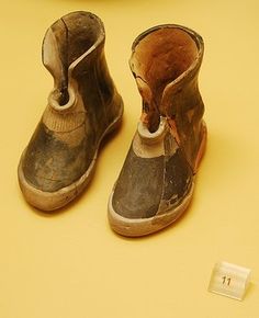 These ancient Greek boots are pair of terracotta boots. Early geometric period cremation burial of a woman, 900 BCE, Ancient Agora Museum,Athens.